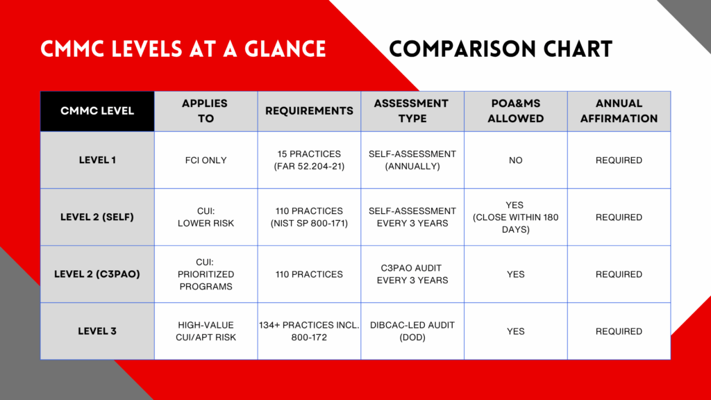 Level 1 covers basic safeguarding of FCI (15 controls). Level 2 applies to CUI and includes 110 controls aligned with NIST SP 800-171.